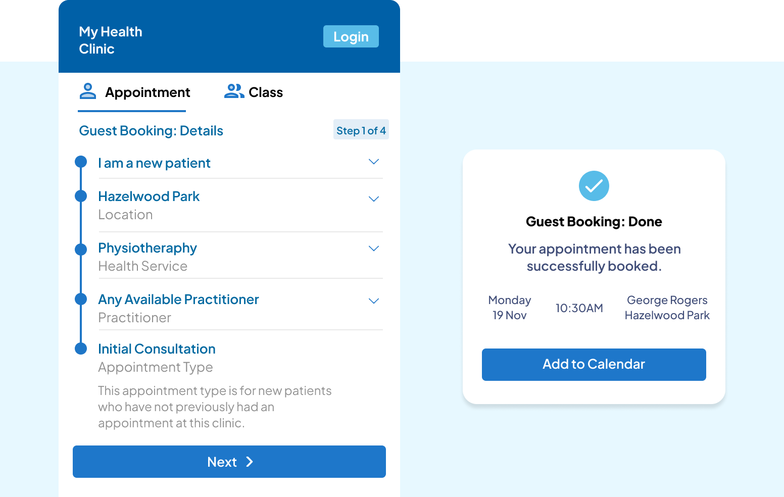 The Front Desk Patient Booking Gateway allows your patients to book individual and group appointments online through your website and social media pages. The advanced rule-based system considers your practice rules, policies and privacy to book valid appointments online 24/7.